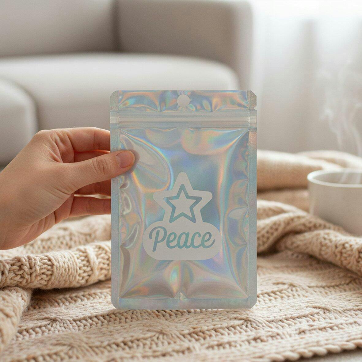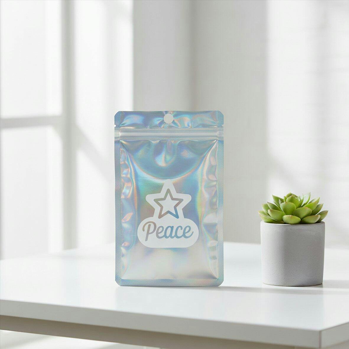 This pouch features a clear front to showcase your product and a laser silver back that shifts colors with the light. The dazzling holographic effect instantly grabs attention, making it perfect for retail displays, online shops, and gift packaging.